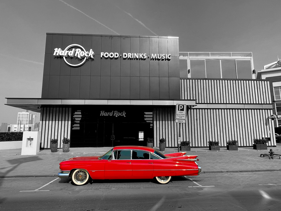 The stunning photos are beautifully complemented by the bright blue sky and the red Cadillac parked in front of the main entrance.